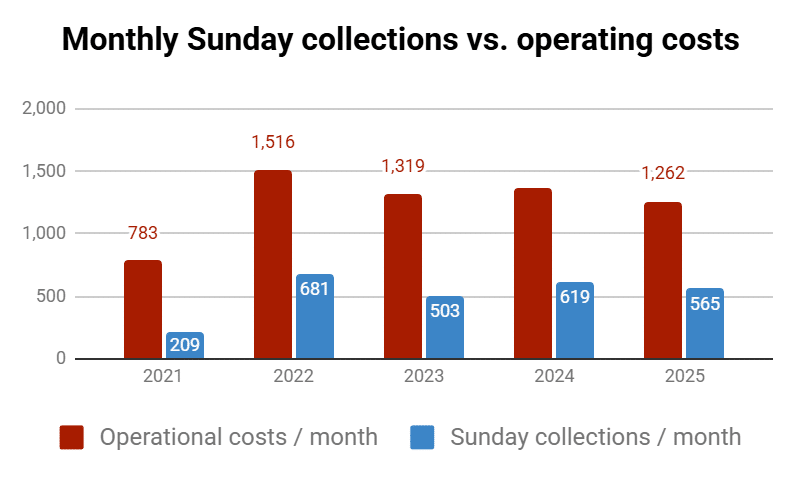 Despite these temporary factors, collections remain structurally low and continue to fall short of covering basic operating costs such as energy, liturgy consumables, insurance, and maintenance.