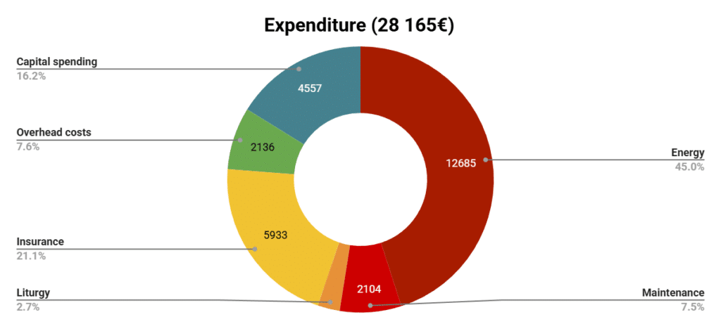 - Operating costs (energy, insurance, maintenance, liturgy, administration) amounted to about €15,148 (€1,262 per month).